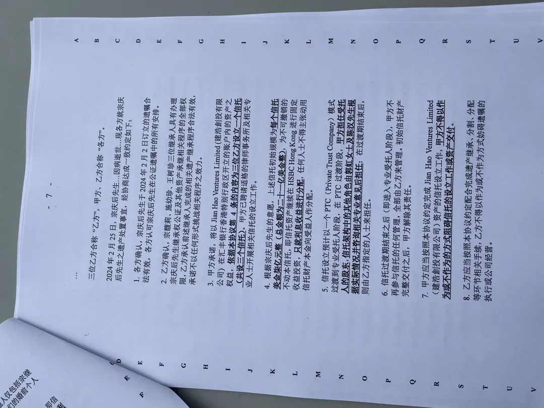 6.2024年3月14日:各方就宗慶后去世引發(fā)的事宜訂立了一份名為《協(xié)議》的文件