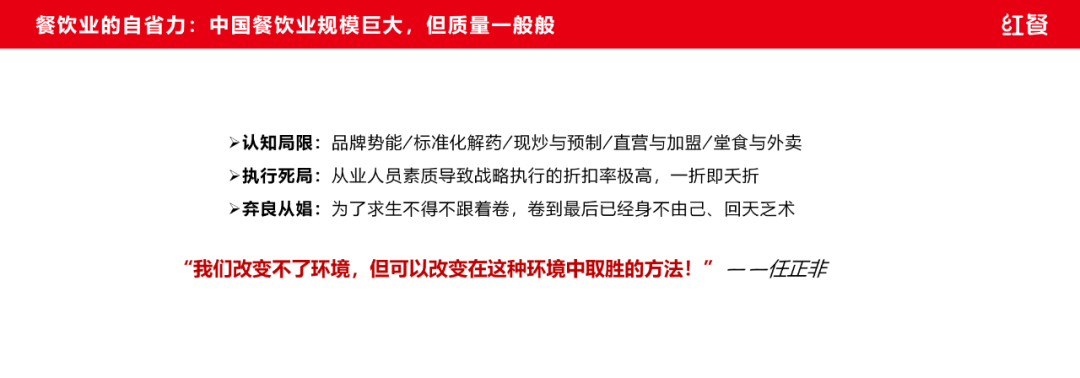 認(rèn)知之外,執(zhí)行也是死局,因?yàn)椴惋嫃臉I(yè)人員的素質(zhì)確實(shí)相對(duì)較低。如果不解決店員和店長的素質(zhì)能力提升問題,戰(zhàn)略層層打折下來,最后就是夭折。餐飲業(yè)戰(zhàn)略執(zhí)行的折扣率比外賣的折扣率還要高。