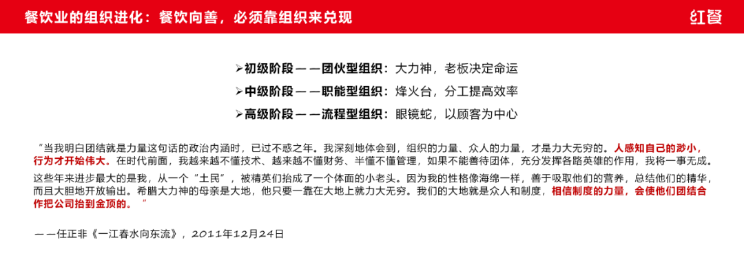 中后臺(tái)還需要建立“四個(gè)軍”:火箭軍負(fù)責(zé)提供重武器;補(bǔ)給軍提供精神和物質(zhì)補(bǔ)給,不管人、錢、物都能支援前線;信息軍負(fù)責(zé)市場信息數(shù)據(jù)的管理和提供,紅餐網(wǎng)也是我們餐飲企業(yè)的信息軍;最后一個(gè)是風(fēng)控軍,不光是食品安全,還有財(cái)務(wù)及人事風(fēng)險(xiǎn)等。