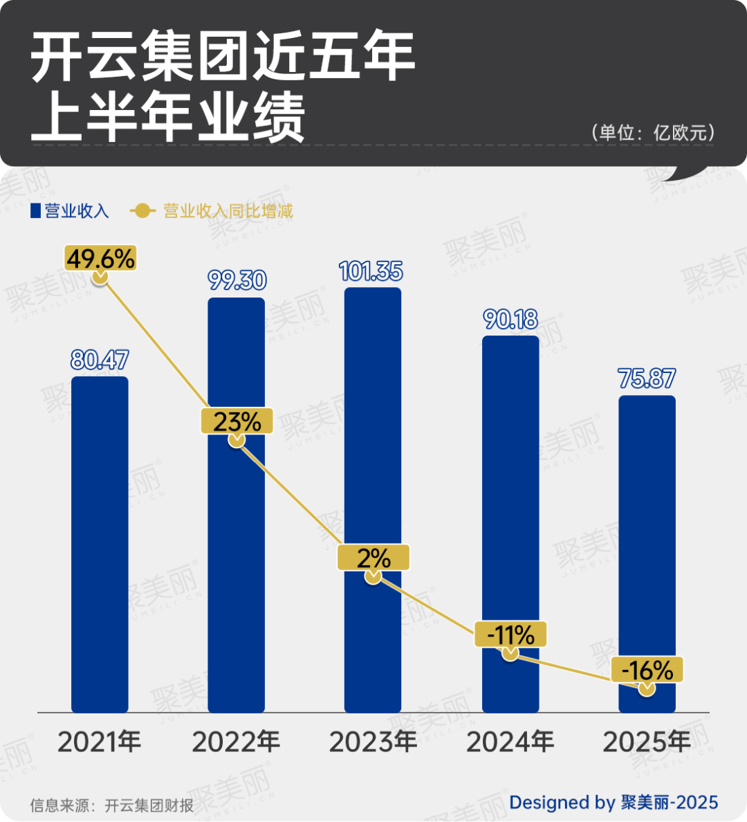 另外,拉長時間線,開云集團近五年半年度營收起伏較大,增幅上更是一路下滑,從49.6%到-16%,其中在2023上半年營收最高,為101.35億歐元(人民幣約840.39億元),此后又開始走下坡路,2025上半年的營業(yè)收入甚至低于2021年疫情時期。
