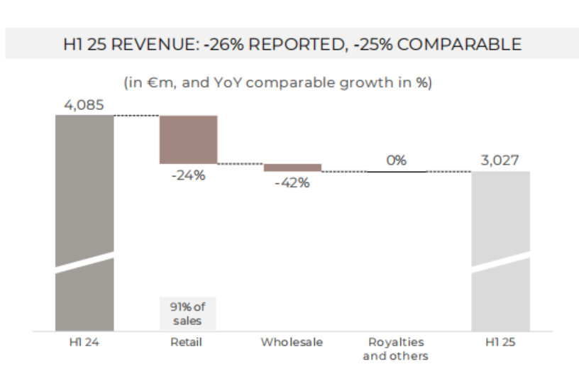 對此,匯豐銀行分析師在財報發(fā)布前的一份報告中表示:“開云集團管理層的變化是積極的,但短期內(nèi)盈利仍將面臨壓力,LUCA DE MEO要到9月15日才會上任,而且他不太可能在預(yù)計2026年2月公布全年業(yè)績之前提出他的戰(zhàn)略計劃!