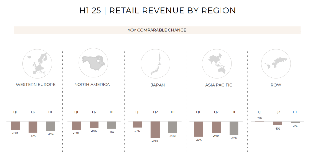 具體分析上半年奢侈品集團在市場端的營收表現(xiàn)來看,西歐和亞太(除日本)以29%的占比,成為開云集團最大銷售市場。而五大市場中,就零售業(yè)務(wù)而言,除其他地區(qū)(-2%)外,其余市場均呈現(xiàn)雙位數(shù)大幅下跌。其中亞太地區(qū)同比下降最大,為22%。