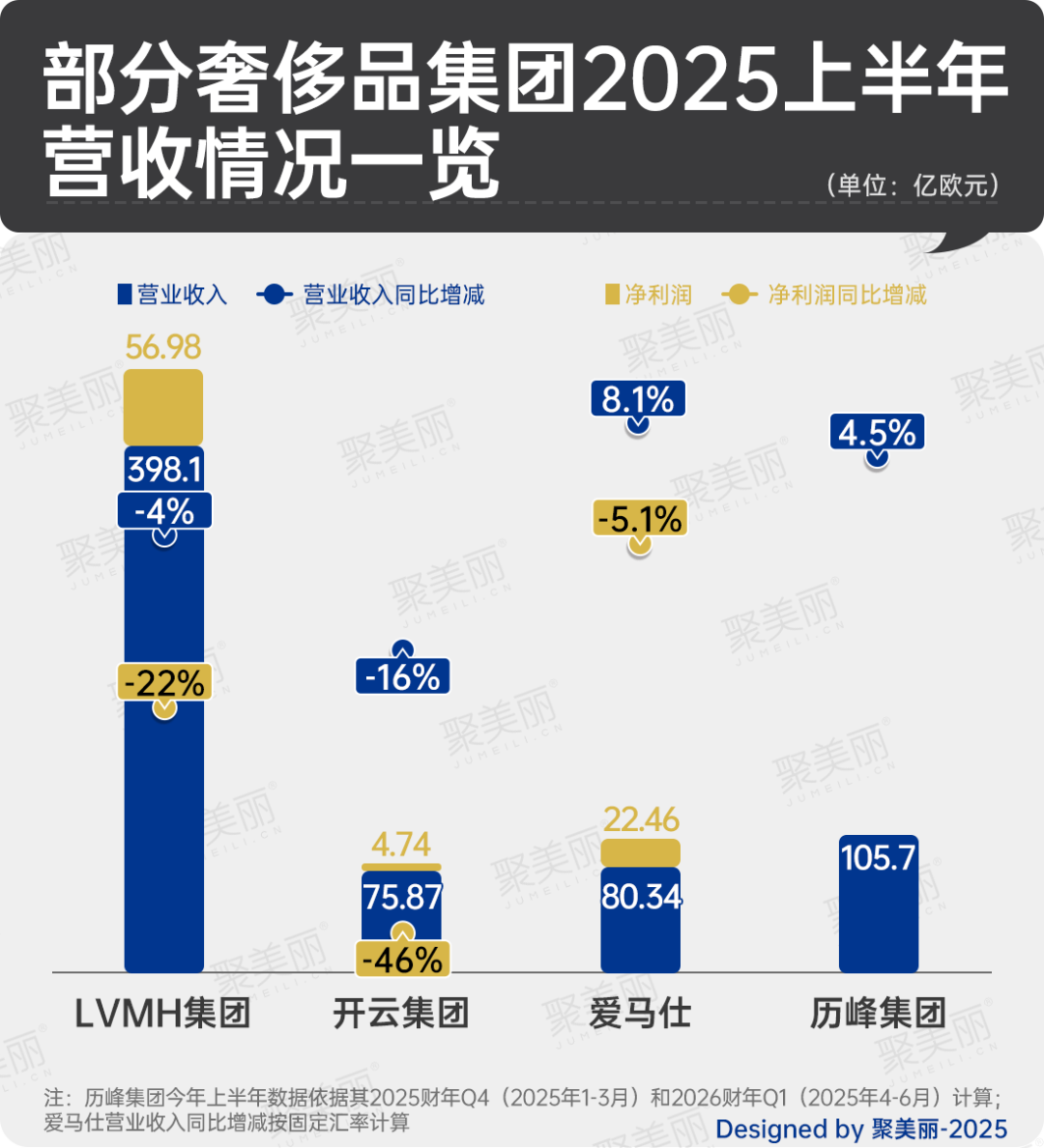 開云集團的業(yè)績承壓并非孤例。如下圖所示,2025年上半年,LVMH集團和開云集團的營業(yè)收入和凈利潤均呈下降。愛馬仕則增收不增利。