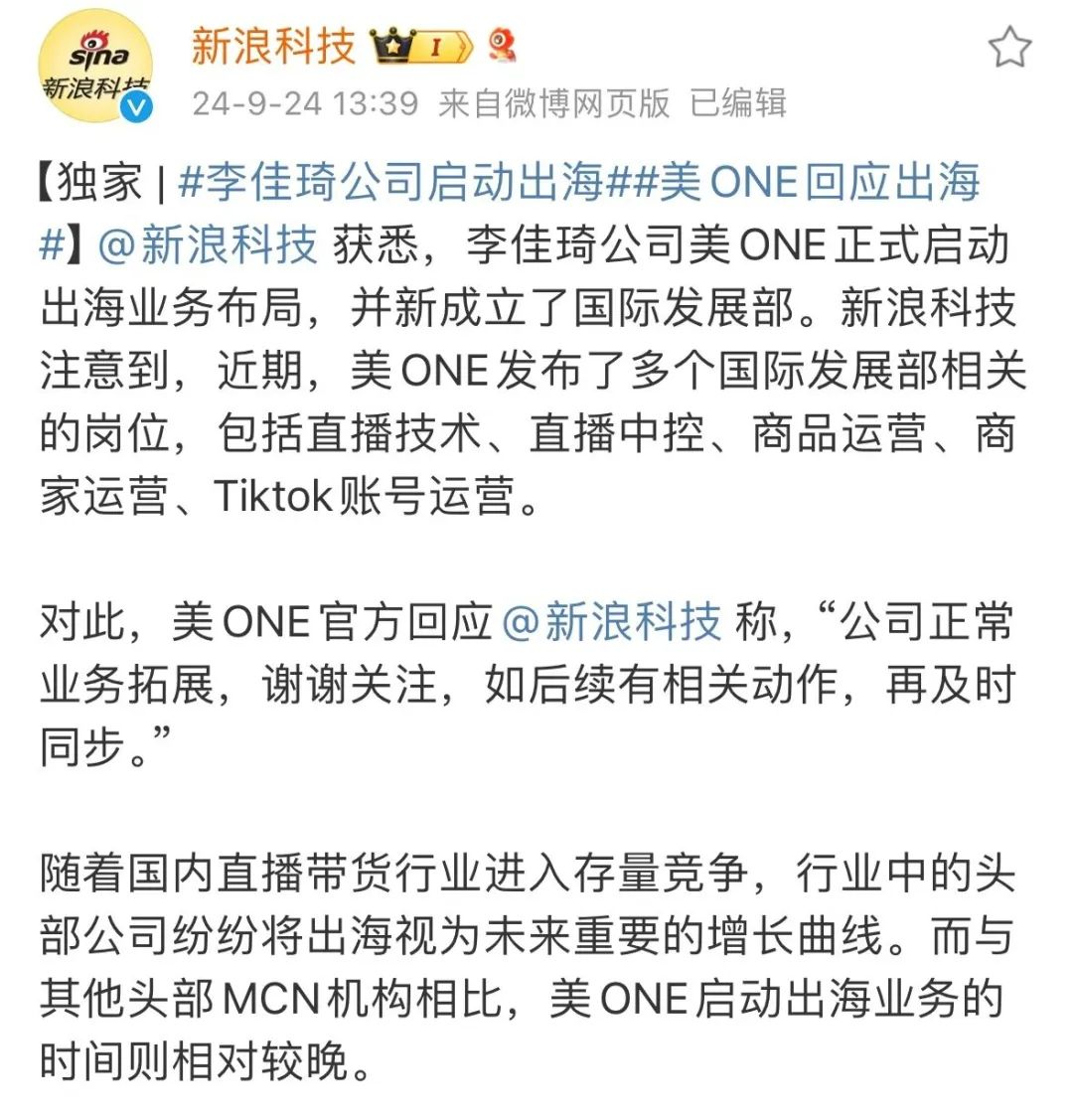 同年,李佳琦所屬公司美ONE正式啟動出海業(yè)務布局,并專門成立了國際發(fā)展部,這充分顯示出其對海外市場的高度重視。