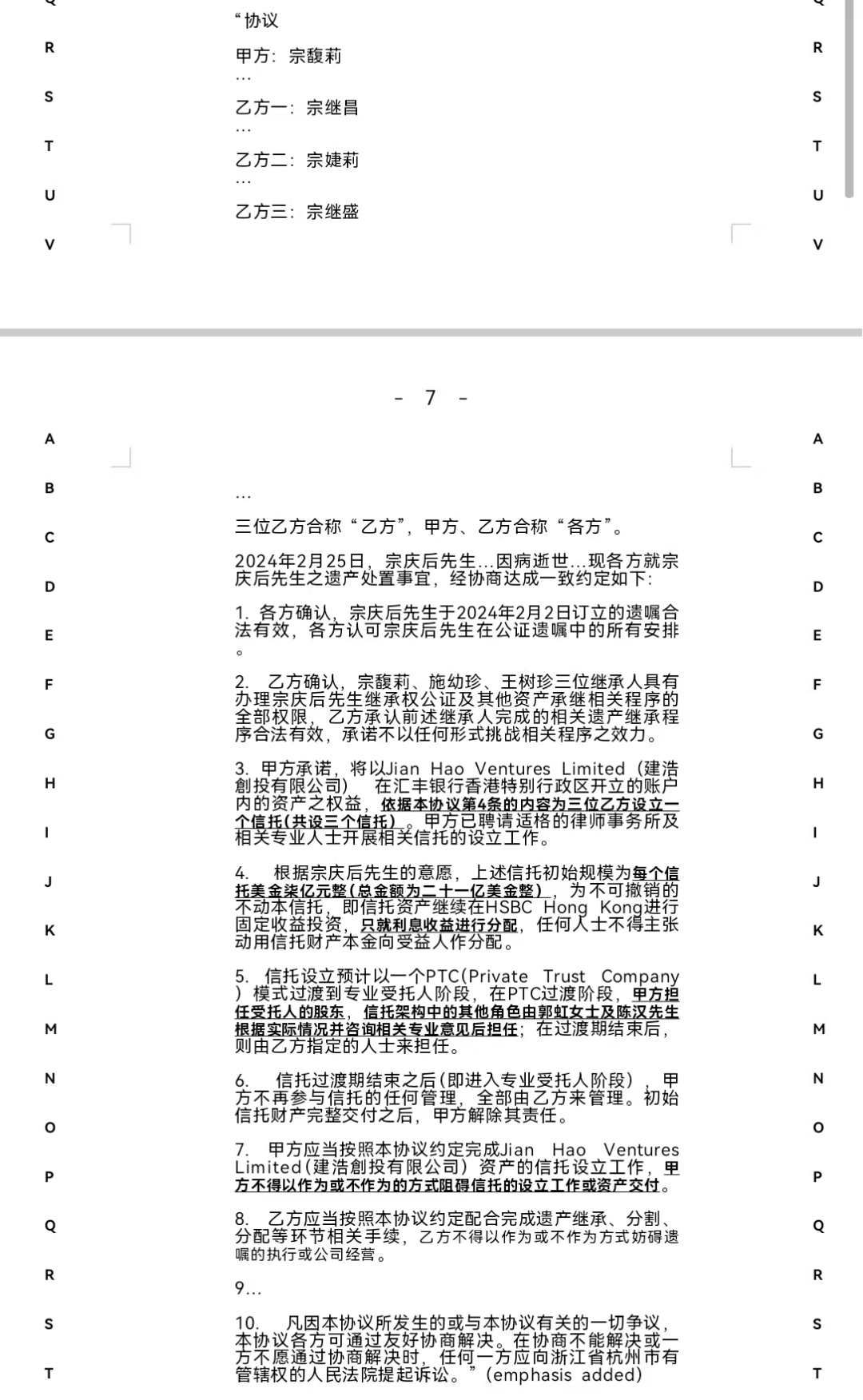 不過(guò),香港高等法院的法官也特別強(qiáng)調(diào)——“本案的訴訟并不涉及宗慶后的遺產(chǎn)的管理事項(xiàng),前述背景僅為后文提及的相關(guān)協(xié)議提供理解基礎(chǔ),該等協(xié)議中提及了上述遺囑!