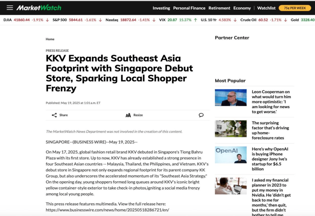 這家中國(guó)精致生活方式品牌入駐國(guó)際奢侈品大牌云集的新加坡黃金商圈后,不僅吸引大量當(dāng)?shù)啬贻p人排隊(duì)打卡,也引發(fā)《華爾街日?qǐng)?bào)》旗下聚焦資本市場(chǎng)的專業(yè)媒體Market Watch的關(guān)注報(bào)道,評(píng)價(jià)稱“此舉進(jìn)一步強(qiáng)化了KKV的東南亞提速擴(kuò)張戰(zhàn)略”。