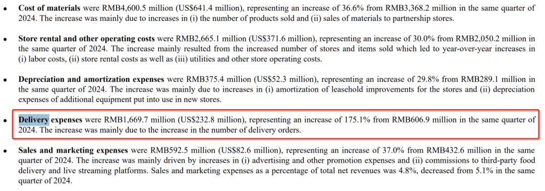 根據(jù)瑞幸首席財(cái)務(wù)官安靜在電話會(huì)議上的介紹,2025 年第二季度,瑞幸咖啡的配送費(fèi)用同比增長了 175% 至 17 億元,主要因外賣平臺(tái)訂單量同比大幅增加。因此,配送費(fèi)用占總凈收入的比例從 2024 年同期的 7% 升至 14%,與外賣量增長相符。
