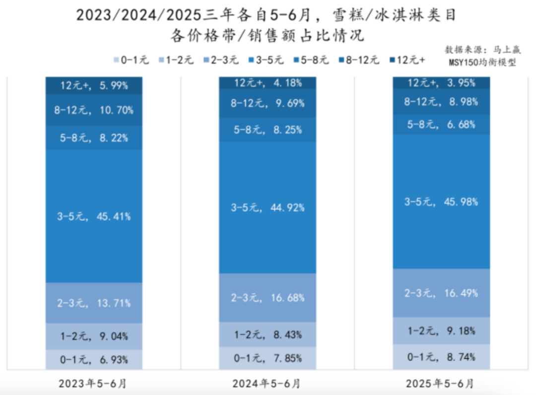 馬上贏數(shù)據(jù)顯示,2025年5-6月,3-5元冰淇淋銷售額占比達45.98%,而12元以上產(chǎn)品占比僅3.95%。這種變化反映出消費者更注重“質(zhì)價比”與“性價比”的平衡,而非單純追求品牌溢價。