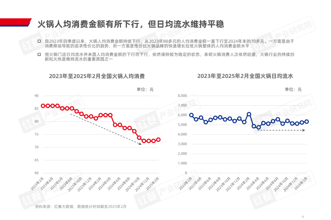 更令火鍋從業(yè)者感到焦慮的是,因經(jīng)濟(jì)承壓,消費(fèi)者的消費(fèi)能力還不斷走低。紅餐產(chǎn)業(yè)研究院統(tǒng)計(jì)的數(shù)據(jù)顯示,近年來(lái),火鍋人均消費(fèi)金額持續(xù)下行,從2023年80多元一路下行至2024年末的70多元。