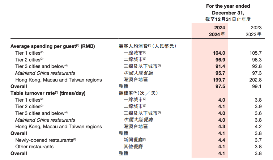 在此背景下,海底撈也難以獨(dú)善其身。財(cái)報(bào)顯示,截止2024年年末,海底撈自營(yíng)餐廳門店數(shù)為1355家,同比減少19家。雖然2024年,海底撈開放加盟,引入了13家加盟店,但計(jì)入加盟店后,海底撈門店總數(shù)僅為1368家,仍不及2023年的1374家。