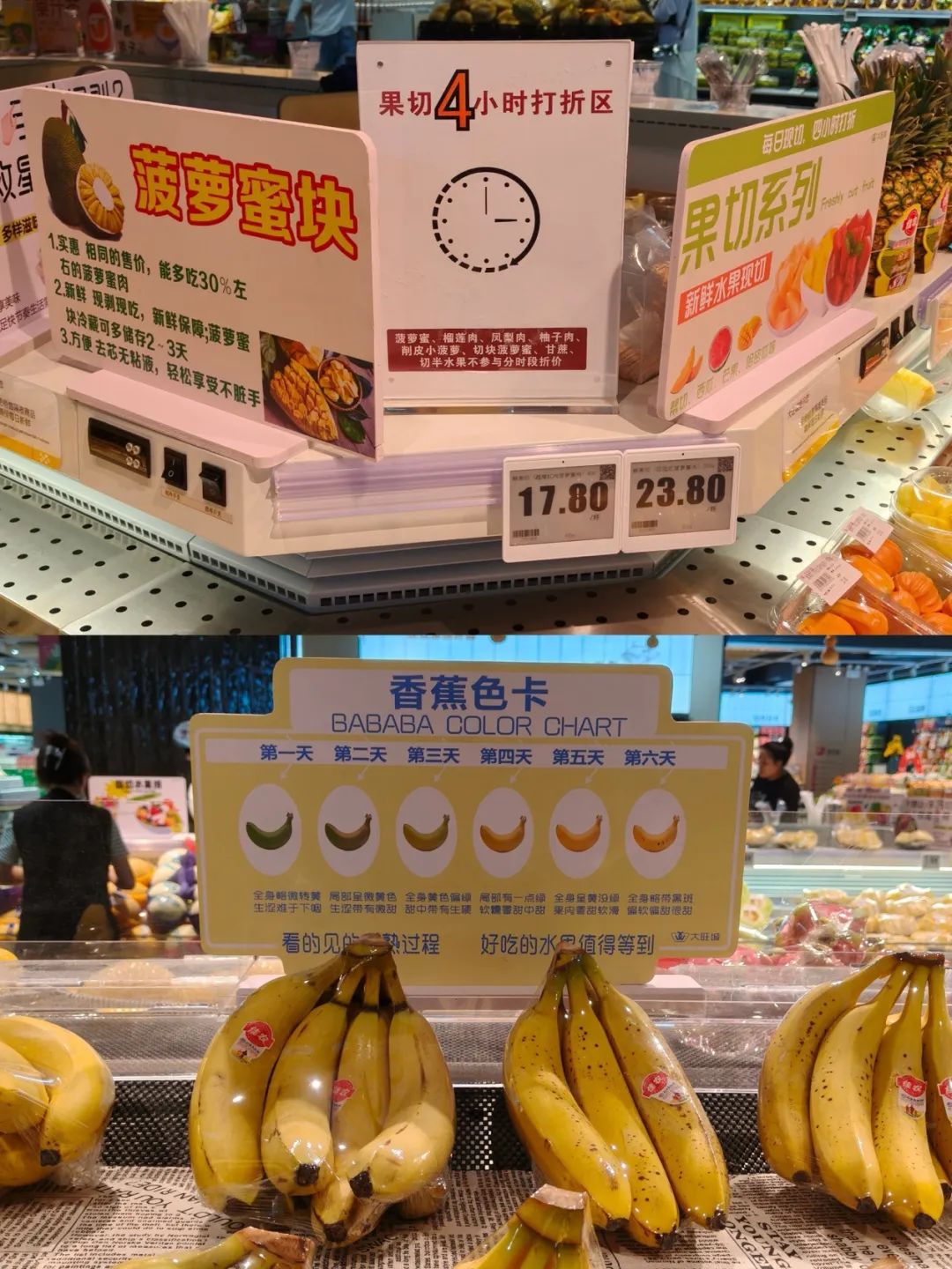 例如,榴蓮售出后24小時內(nèi),若出現(xiàn)生包、死包、蟲果問題,可享受售后服務;果切類商品上架4小時后即打折促銷;香蕉貨架旁的色卡,能幫助消費者直觀區(qū)分不同成熟度與新鮮度的香蕉。