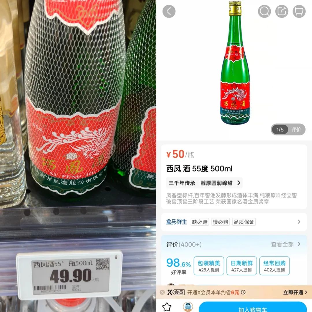 比如大旺城生活超市的魯花5S壓榨一級花生油5L一桶售價149.9元,同款商品在盒馬鮮生售價159.8元;再比如大旺城的西鳳酒55度綠瓶500ml售價49.9元,同款商品在盒馬售價50元。