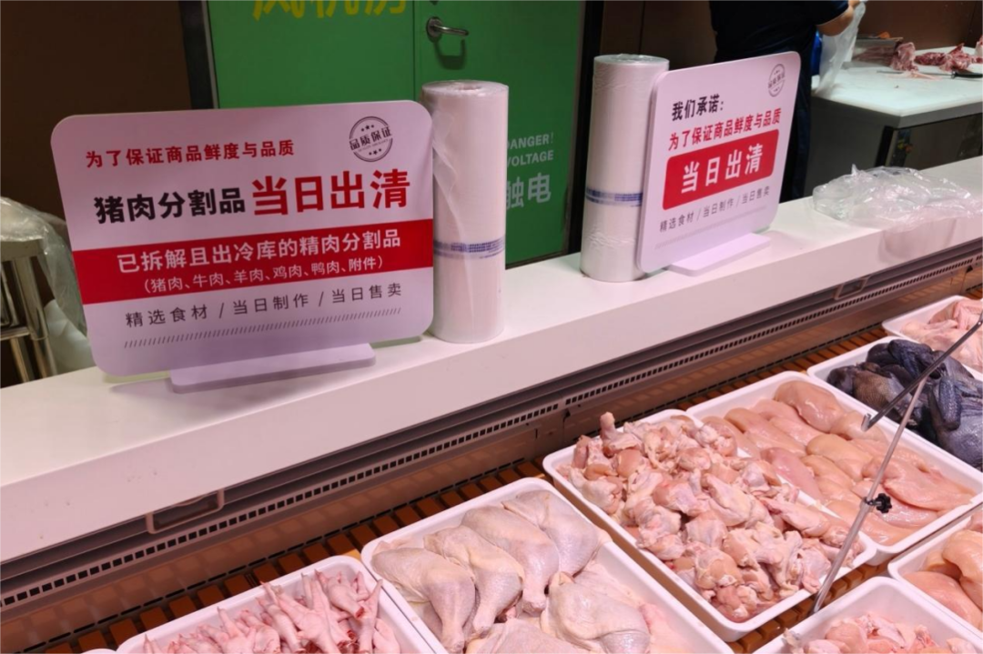 熟食區(qū)、烘焙區(qū)與水果區(qū)的醒目招牌清晰提示:拒絕銷售隔夜商品、確保每日新鮮;肉類區(qū)更是明確標注“豬肉分割品當日出清”。