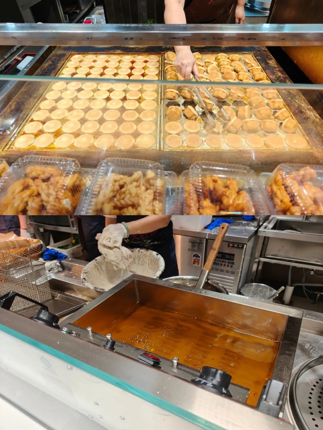 消費者在店內(nèi)能直觀看到:員工在操作高溫油鍋現(xiàn)炸薯條、掛在吊爐上的烤鴨還在滴油、醬香餅千層餅都有專門的操作廚具、老式蛋糕也是現(xiàn)場明檔制作后從烤箱中取出直接銷售。