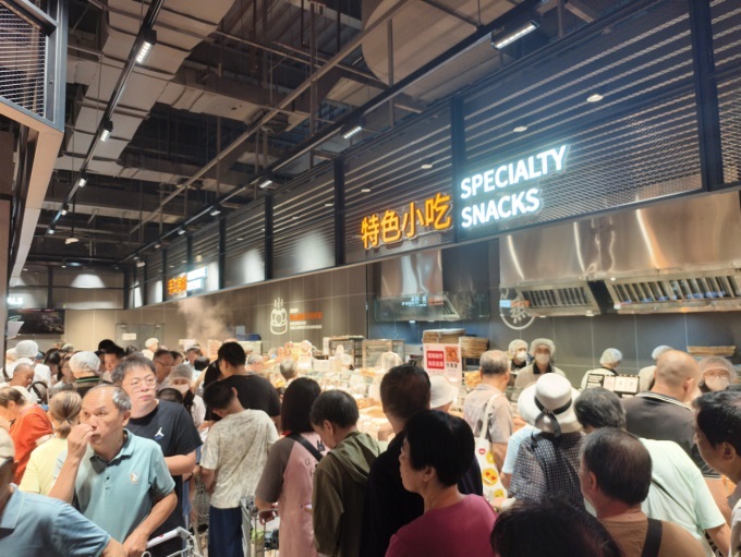 在果切區(qū),新增的冷萃茶與廣西酸野令人眼前一亮,每盒果切標注甜度編號,提示牌盡顯巧思;蔬菜區(qū)的有機菜苗嫩葉帶露,閩北高山空心菜與花青素紫甘藍組成“健康方陣”,12款定向種植蔬菜的溯源二維碼隨指尖輕掃呈現(xiàn)生長歷程;海鮮區(qū)宛如微型漁市,帝王蟹、波龍、面包蟹、珍寶蟹組成“進口四大金剛”,創(chuàng)新的“海鮮廚房”提供代加工服務解決家庭烹飪難題,“現(xiàn)殺現(xiàn)切+現(xiàn)場烹煮”的服務模式成為一大亮點,充分契合福州消費者對生猛海鮮和便捷加工的高頻需求。