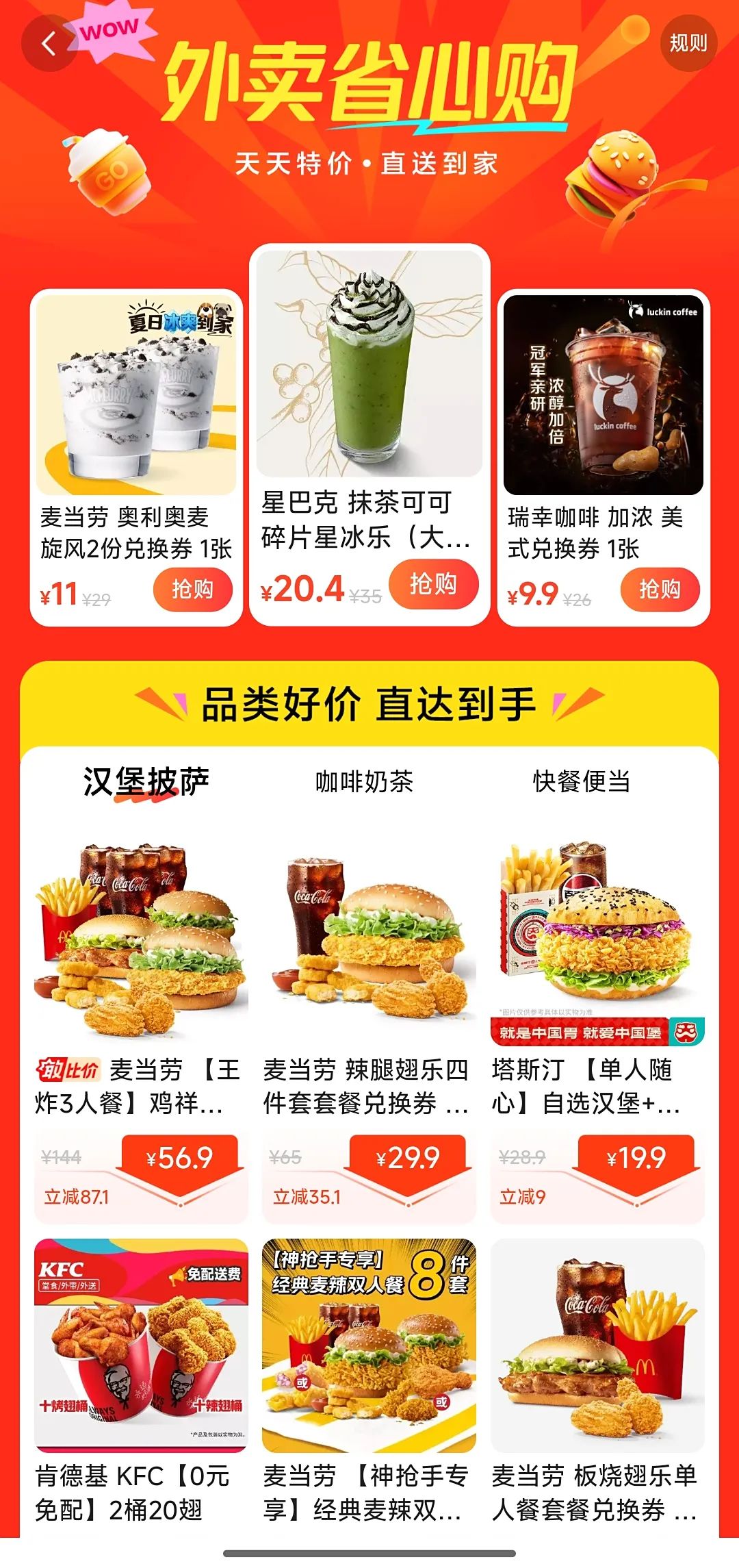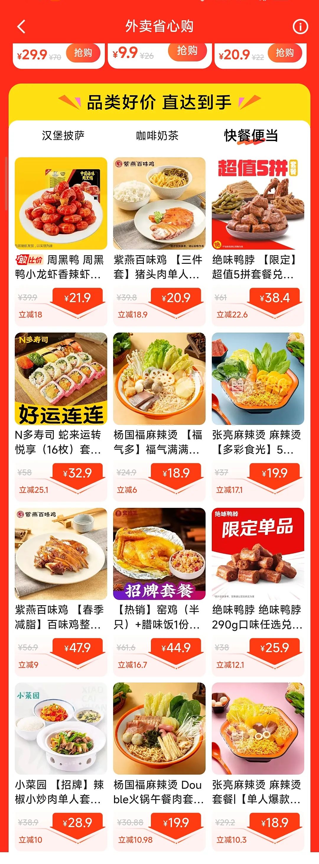 漢堡披薩類有麥當(dāng)勞、塔斯汀的套餐;咖啡奶茶類涵蓋爺爺不泡茶、滬上阿姨、1點(diǎn)點(diǎn)、星巴克、LINLEE林里、CoCo都可等品牌;快餐便當(dāng)則有周黑鴨、紫燕百味雞、絕味鴨脖、N多壽司、楊國(guó)福麻辣燙、張亮麻辣燙、小菜園等商家的產(chǎn)品。