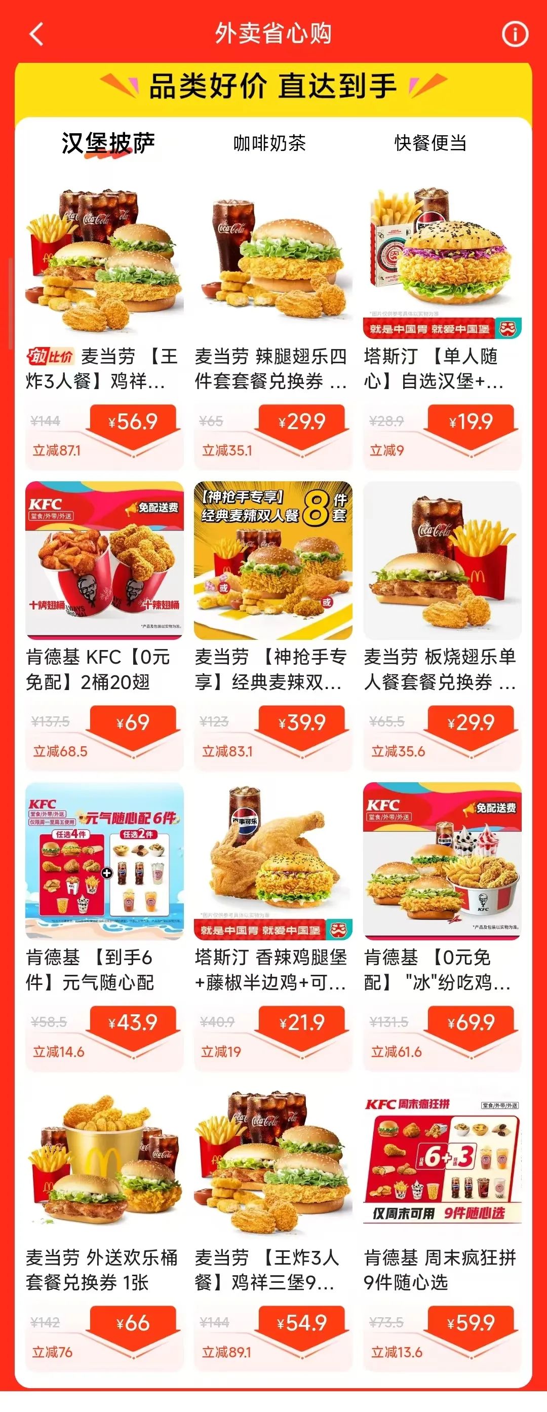 從頁(yè)面看,主要聚焦在漢堡披薩、咖啡奶茶、快餐便當(dāng)這些常見品類。