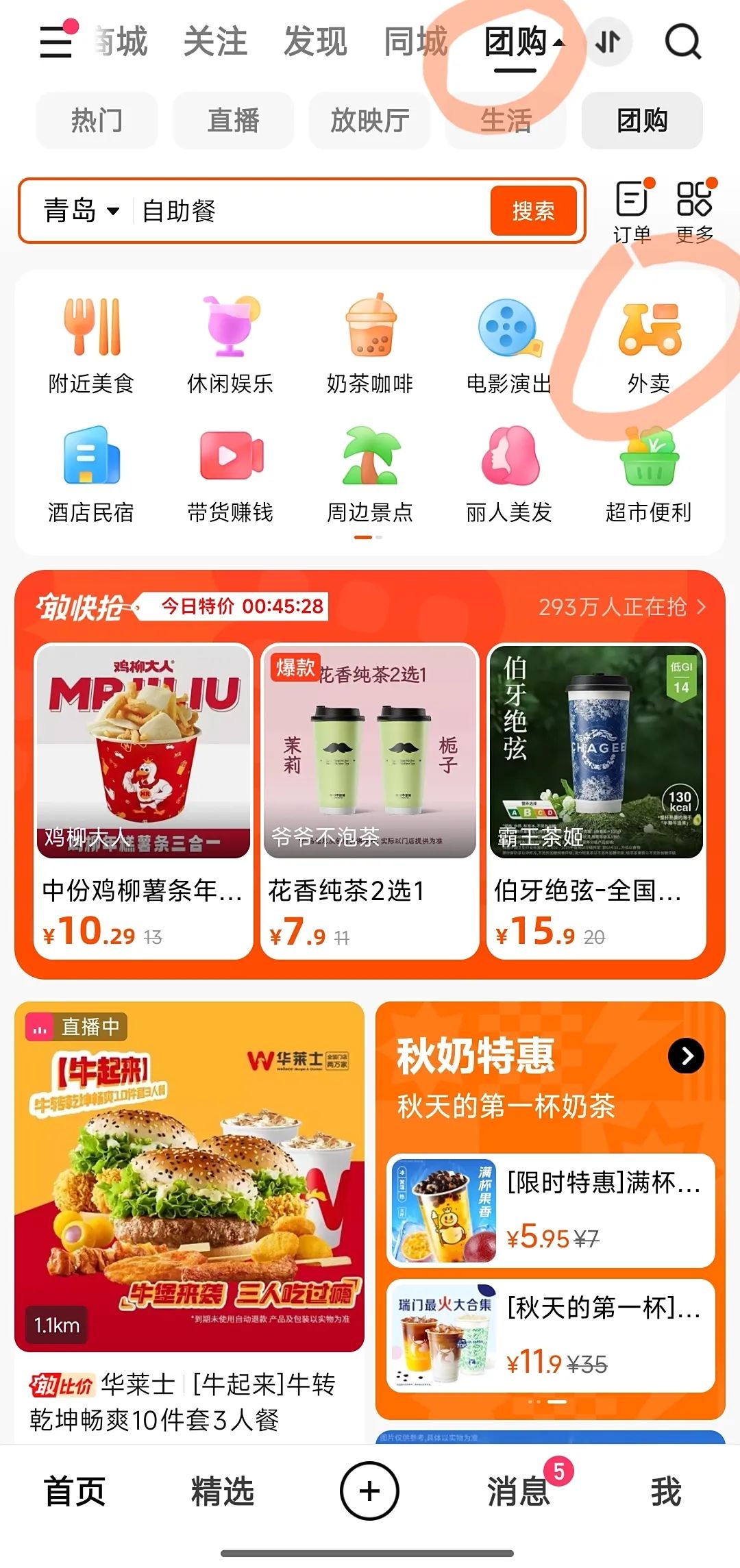 要想直接找到快手外賣并不容易,首先你要先打開快手APP點(diǎn)擊首頁(yè),頂部菜單欄往最右拉可以看到團(tuán)購(gòu)入口,點(diǎn)擊團(tuán)購(gòu)即可在搜索欄的右下角第一行看到明顯的外賣入口。點(diǎn)進(jìn)外賣入口,呈現(xiàn)的商家和商品類別依然并豐富。