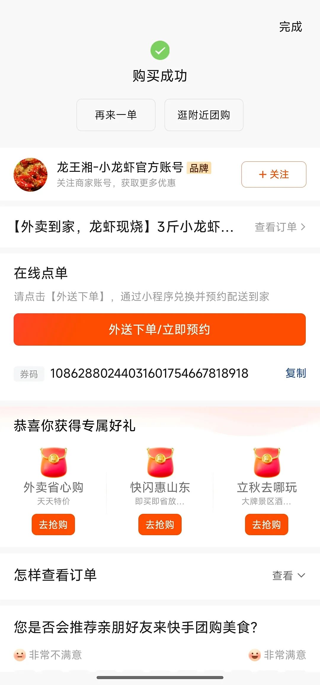 比如我所在的青島的一家“小牛家東北燒烤”,就有很多僅支持外賣的商品套餐,同樣也是先團(tuán)購(gòu)后,再與商家預(yù)約才能實(shí)現(xiàn);而這家叫“龍王湘小龍蝦”的既有支持三天內(nèi)多個(gè)時(shí)間段的配送到家服務(wù),也有下單后可直接跳轉(zhuǎn)到其小程序在進(jìn)行外賣預(yù)約配送到家服務(wù)。