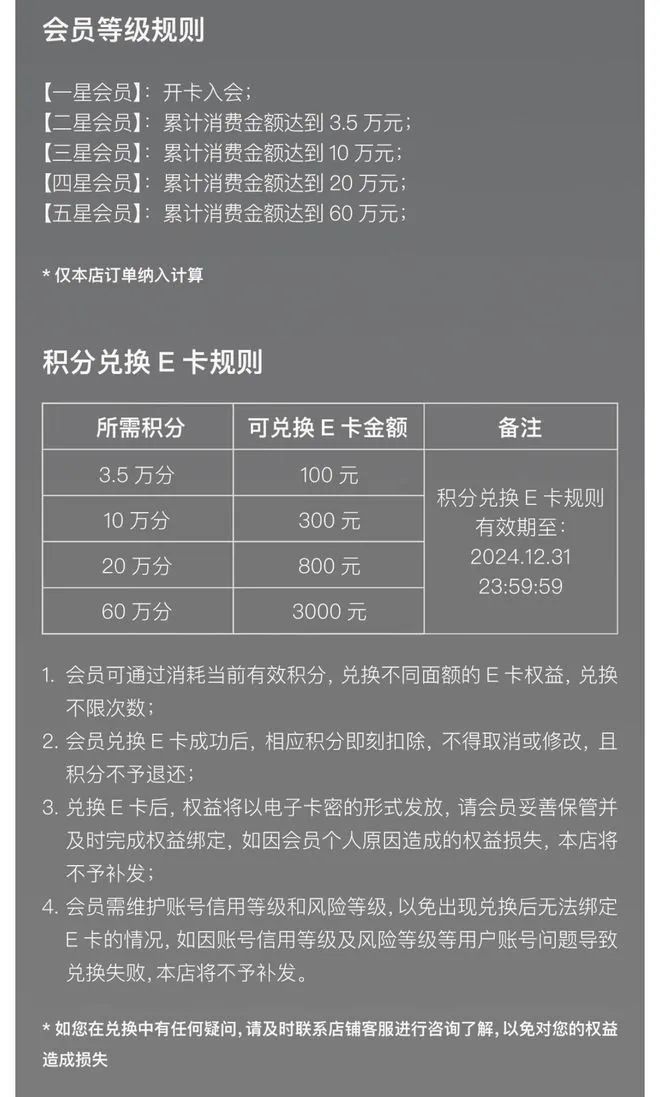 該體系上線(xiàn)時(shí),企業(yè)店鋪會(huì)員等級(jí)共分5檔:開(kāi)卡即成為一星會(huì)員;累積3.5萬(wàn)積分升為二星會(huì)員;10萬(wàn)積分對(duì)應(yīng)三星會(huì)員;20萬(wàn)積分可至四星會(huì)員;最高等級(jí)的五星會(huì)員需60萬(wàn)積分,即累計(jì)消費(fèi)滿(mǎn)60萬(wàn)元。