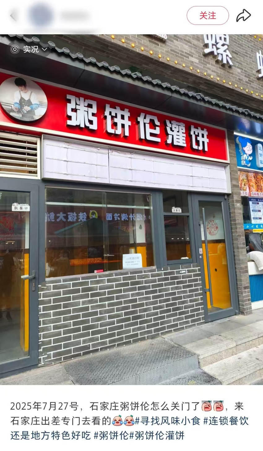 據(jù)華商網(wǎng)報(bào)道,今年1月,“粥餅倫雞蛋灌餅”石家莊新店在灣里廟步行街開(kāi)業(yè)。開(kāi)業(yè)當(dāng)天,“粥餅倫”親自到場(chǎng),為新店積極宣傳,不僅與專(zhuān)門(mén)前來(lái)的粉絲互動(dòng)合影,還在現(xiàn)場(chǎng)為消費(fèi)者服務(wù),現(xiàn)場(chǎng)十分熱鬧。然而,據(jù)海報(bào)新聞報(bào)道,7月27日,有游客前往門(mén)店打卡時(shí),發(fā)現(xiàn)該店已關(guān)門(mén)歇業(yè)。另?yè)?jù)隔壁店鋪工作人員透露,門(mén)店已關(guān)停數(shù)日。