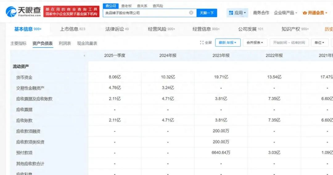 天眼查APP顯示:截至到2025年一季度末,良品鋪子的總資產(chǎn)為38.86億元,又同比下滑了19.59%。其中,貨幣資金為8.064億元,交易性金融資產(chǎn)為4.757億元,整體資金儲備狀況并不算好看。
