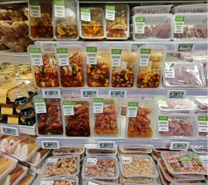 商品包裝化,使得全渠道效率更高,也有利于進一步優(yōu)化現(xiàn)場環(huán)境,風(fēng)幕冷藏柜的各種預(yù)包裝肉類,非常豐富;精選商品、箱式陳列、周轉(zhuǎn)筐轉(zhuǎn)運提高員工作業(yè)效率;開業(yè)期間,在外臨時增設(shè)大量人工和自助收銀,提高購物效率。