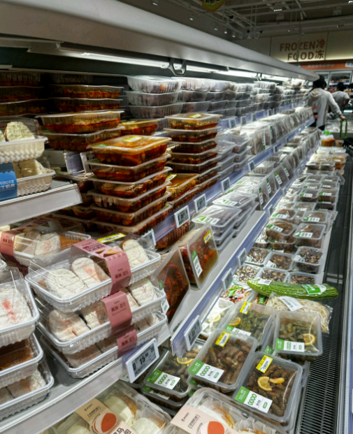 不管是大賣場還是社區(qū)店,乃至便利店,當(dāng)前的3R(即食、即烹、即熱)已經(jīng)成為基本支柱。在鮮風(fēng)梧桐里店,沒有現(xiàn)場加工,但3R類商品的豐富度、品質(zhì)感、陳列量感,給顧客十足的購買欲。