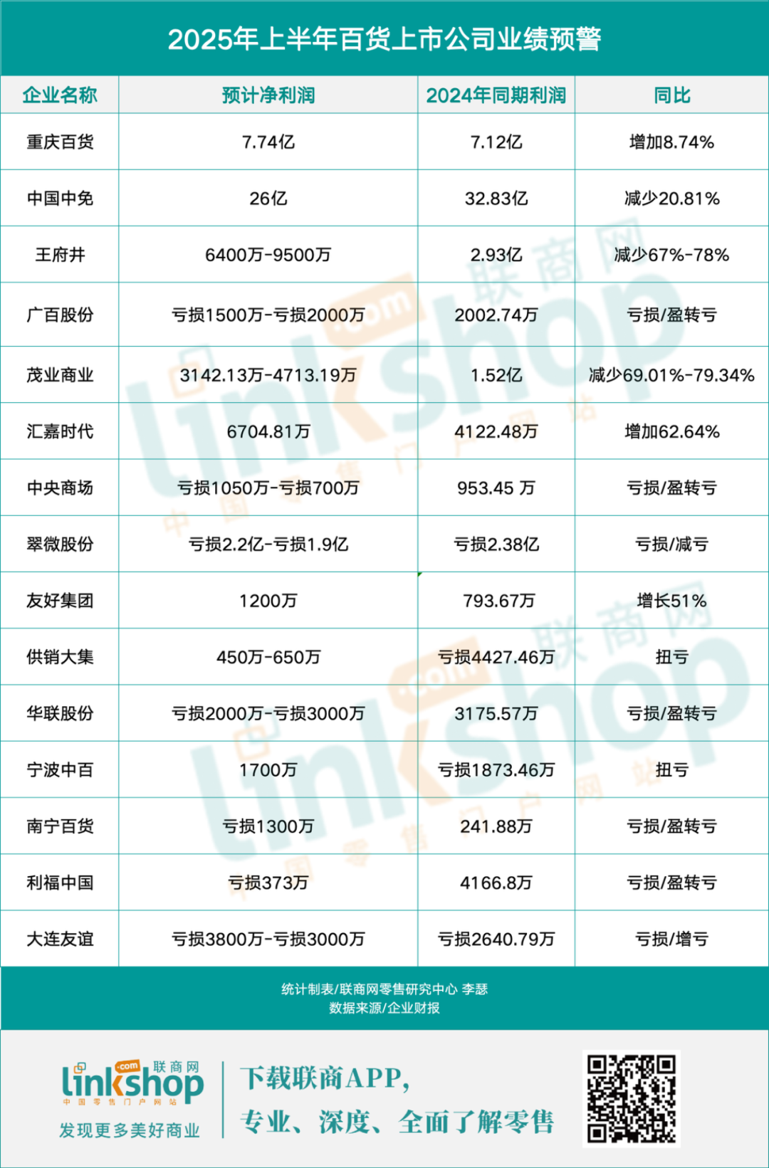 《聯(lián)商網(wǎng)》統(tǒng)計發(fā)現(xiàn),截至目前已經(jīng)有15家百貨上市公司披露了2025年上半年業(yè)績快報,總體如下: