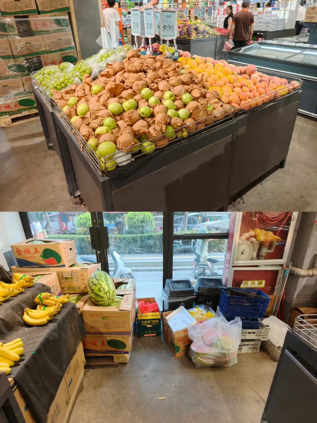 除了日化、快消等標(biāo)品外,京小盒還會(huì)售賣少量的水果蔬菜,以滿足周邊社區(qū)居民基本的生鮮采買需求,而部分門(mén)店內(nèi)生鮮果蔬也都是最簡(jiǎn)易的陳列方式,只有少量肉類和豆制品等儲(chǔ)存在冰柜內(nèi)。