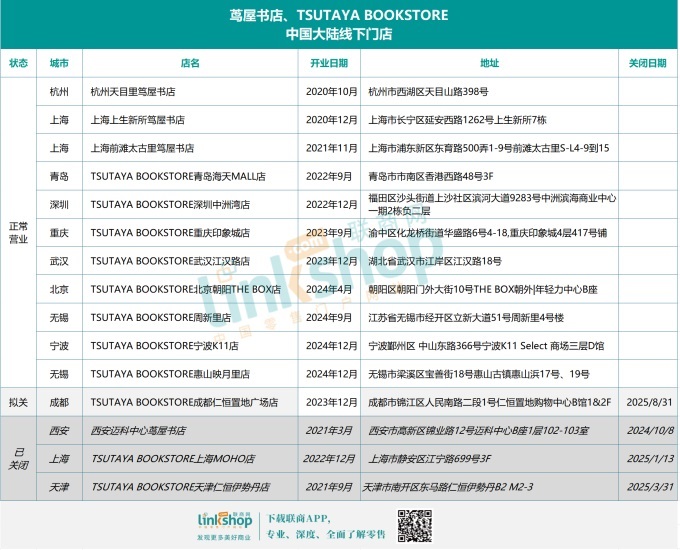 2020年10月,蔦屋書店正式進入中國大陸市場,在杭州天目里開出了首店,隨后開始進入上海、西安、天津、成都、青島、深圳、重慶、武漢和北京等城市,高峰期門店數(shù)量有15家,其中上海就有3家。