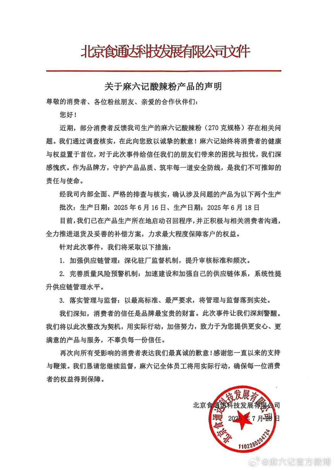 于是,在7月28日,麻六記官方發(fā)布聲明稱,“近期,部分消費者反饋我司生產(chǎn)的麻六記酸辣粉(270克規(guī)格)存在相關(guān)問題。我們通過調(diào)查核實,在此向您致以誠摯的歉意!麻六記始終將消費者的健康與權(quán)益置于首位,對于此次事件給信任我們的朋友們帶來的困擾與擔憂,我們深感愧疚……目前,我們已在產(chǎn)品生產(chǎn)所在地啟動召回程序,并正積極與相關(guān)消費者溝通全力推進退貨及妥善的補償方案,力求最大程度保障客戶的權(quán)益!