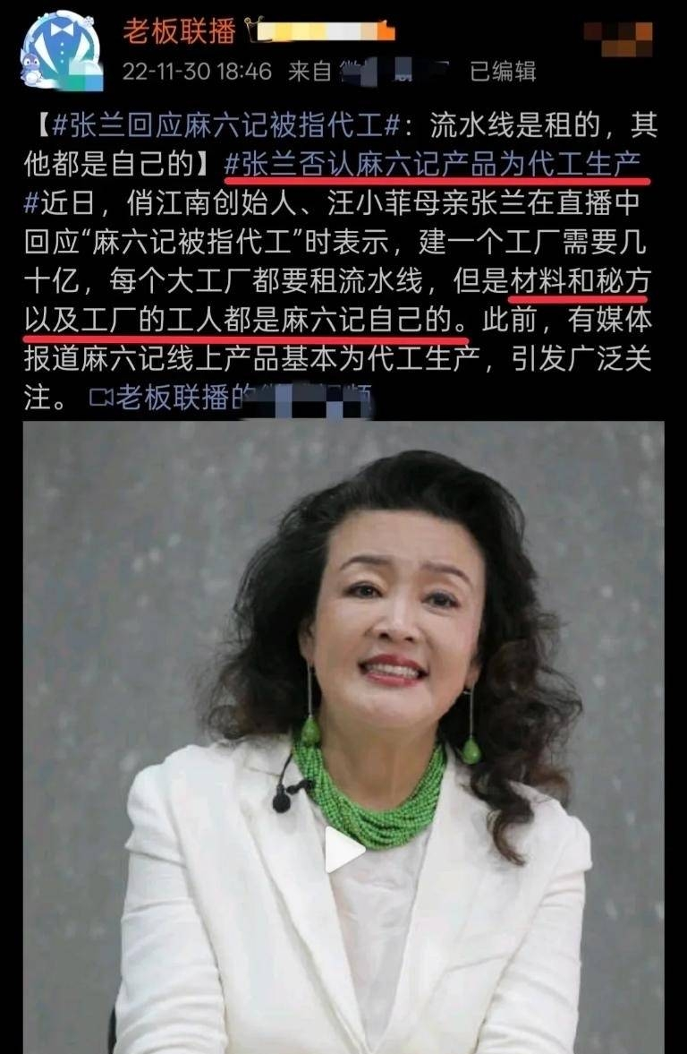 面對網(wǎng)絡(luò)上愈發(fā)洶涌的輿論,麻六記也不得不出來回應(yīng)了,畢竟張?zhí)m此前曾在直播間信誓旦旦地表示麻六記產(chǎn)品不是代工生產(chǎn),其除了流水線是租的,其他的包括材料、秘方、工廠工人都是麻六記自己的。