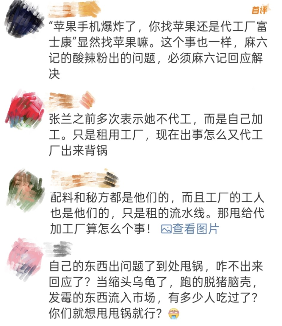 然而,代工廠白家阿寬的道歉聲明未能平息眾怒,大量網(wǎng)友紛紛喊話汪小菲和張?zhí)m出來回應(yīng)。“張?zhí)m之前多次表示她不代工,而是自己加工。只是租用工廠,現(xiàn)在出事,怎么又代工廠出來背鍋!薄芭淞虾兔胤蕉际撬麄兊,而且工廠的工人也是他們的,只是租的流水線。那甩給代加工廠算怎么個事!”“麻六記的酸辣粉出的問題,必須麻六記回應(yīng)解決!