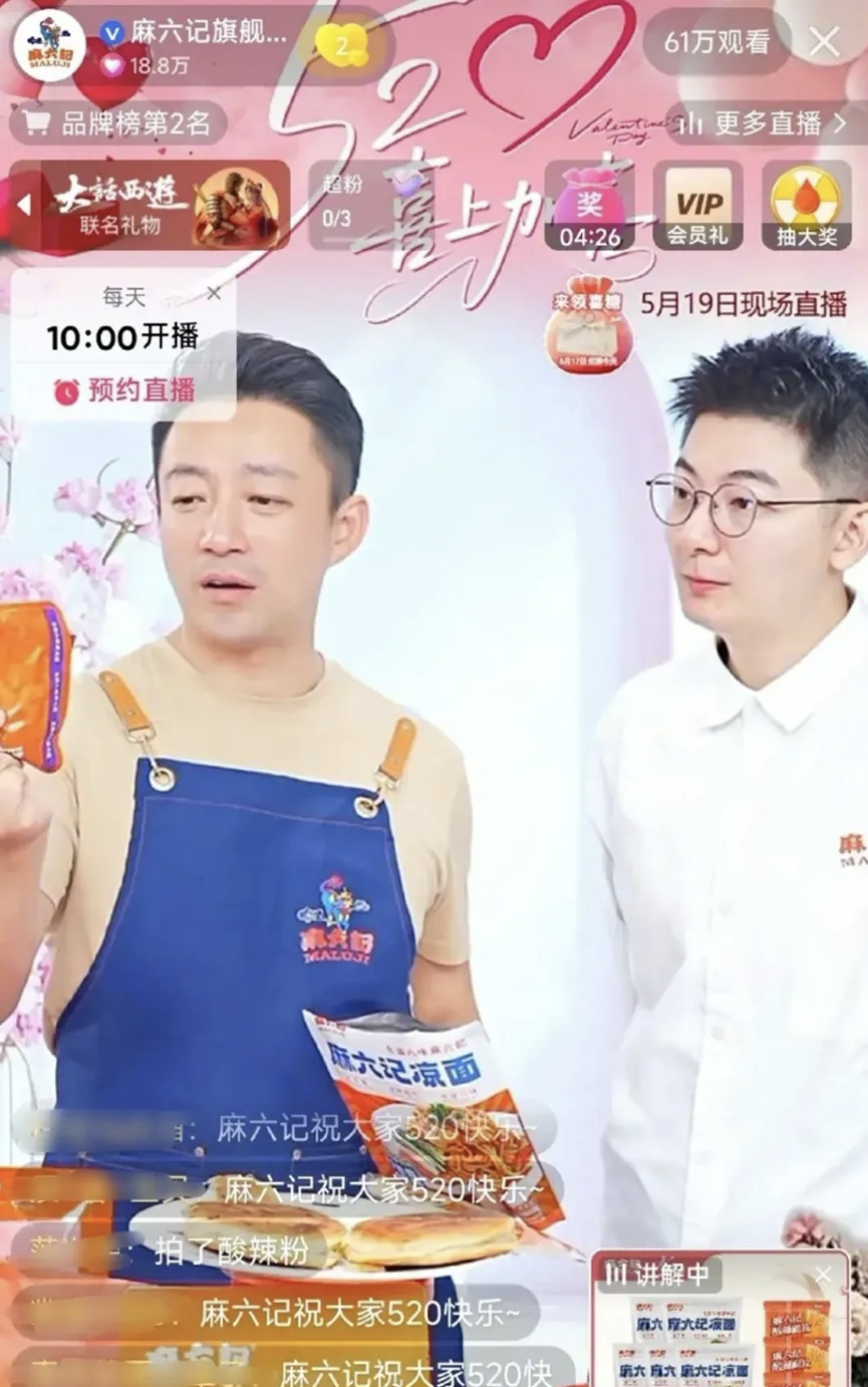 時間來到5月,汪小菲剛剛結(jié)束與二婚妻子馬筱梅的婚禮,就趁著結(jié)婚的熱度,來到了麻六記直播間,親自為消費者介紹麻六記產(chǎn)品。不出所料,汪小菲一出現(xiàn)在直播間,就引來了超60萬觀眾,而該直播間也成功登上了品牌榜第二名。