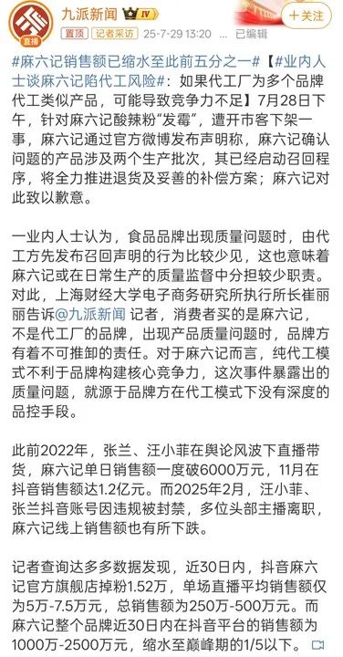 整體來看,離開汪小菲和張?zhí)m這兩個靈魂人物之后,麻六記的直播銷售額正急速下滑。更為雪上加霜的是,產(chǎn)品質(zhì)量安全問題的爆發(fā),這無疑再次將品牌推向了信任危機的懸崖邊緣。同時,這也意味著,麻六記正站在一個關(guān)鍵的十字路口——是繼續(xù)依賴外部流量的“輸血”,還是真正沉下心來,打磨產(chǎn)品,提升服務(wù),以過硬的品質(zhì)和真誠的態(tài)度,重建消費者信任。畢竟,唯有真正對消費者負責、對產(chǎn)品敬畏,才能在市場浪潮中行穩(wěn)致遠。