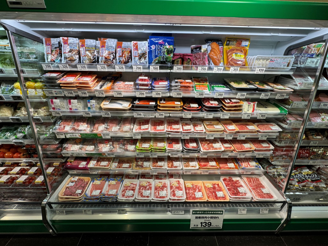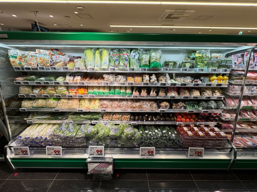 調(diào)研團(tuán)隊(duì)走進(jìn)門店后發(fā)現(xiàn),My Basket生鮮區(qū)域的陳列邏輯與商品組合較為明確。店內(nèi)陳列以水果為主,哈密瓜、西瓜、櫻桃等水果以599日元銷售,注重檔次感,品種齊全;新鮮蔬菜則以購買頻度高的商品和土特產(chǎn)為中心,西紅柿一個(gè)品類就有6種SKU,品種豐富,冷凍蔬菜也放滿了4扇冷凍柜門;加工肉類種類齊全,其中一半以上是精肉包裝商品,刺身僅提供金槍魚和三文魚的切片,重點(diǎn)展示適合簡單烹飪的商品。