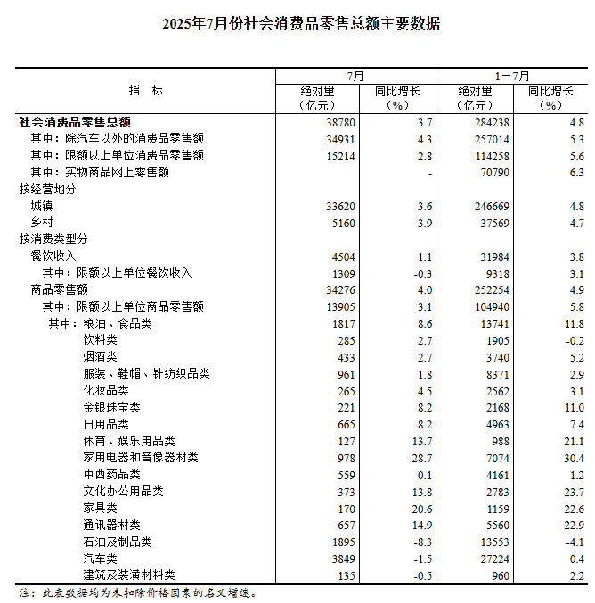 據(jù)國(guó)家統(tǒng)計(jì)局消息,7月份,社會(huì)消費(fèi)品零售總額38780億元,同比增長(zhǎng)3.7%。其中,除汽車以外的消費(fèi)品零售額34931億元,增長(zhǎng)4.3%。1-7月份,社會(huì)消費(fèi)品零售總額284238億元,增長(zhǎng)4.8%。其中,除汽車以外的消費(fèi)品零售額257014億元,增長(zhǎng)5.3%。