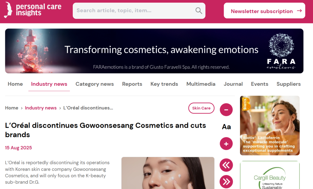 報道顯示,本次調(diào)整后,該業(yè)務(wù)線將啟用簡化名稱 “L’Oréal Korea–Dr.G”,不再使用此前較長的 “L’Oréal–Gowoonsesang Cosmetics–Dr.G” 品牌標(biāo)識。