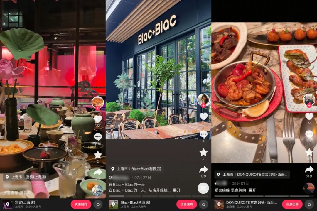 抖音平臺上,探店博主分享的“漂亮飯”新餐廳,左下角就有“2人套餐”的購買鏈接。用戶刷到虎跳峽和賽里木湖的美景視頻,搜索關(guān)鍵詞就能找到旅行攻略和景區(qū)門票、住宿的相關(guān)團購?fù)扑],用一次說走就走的旅行證明自己“不白活”。