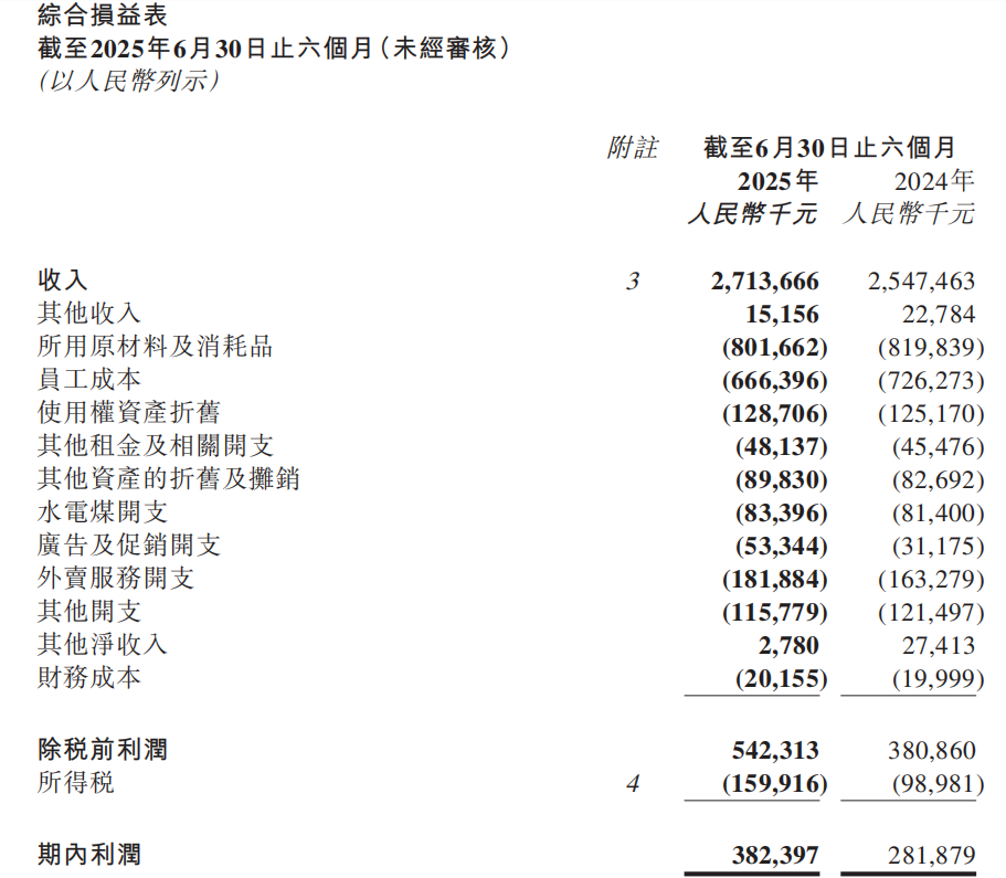 財(cái)報(bào)數(shù)據(jù)顯示,原材料及耗材成本相比去年同期減少2.2%,2025前6個(gè)月年為8.017億元,這主要得益于集中采購降低了主要食材的單位價(jià)格;