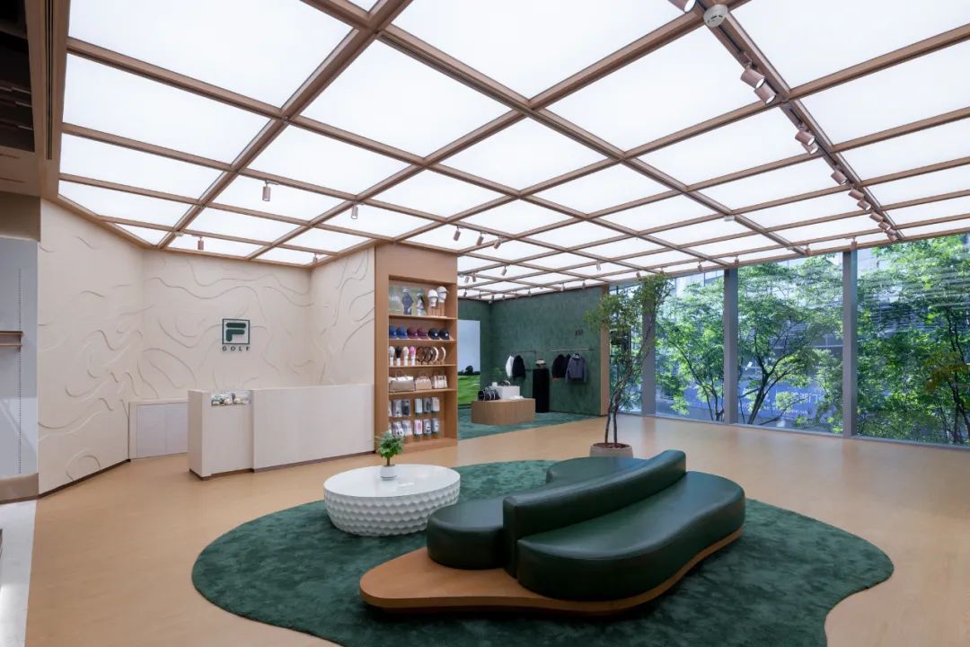 FILA GOLF全新的“Master Club 大師嶺域”,以高爾夫運(yùn)動(dòng)本身的場(chǎng)景為靈感,將“場(chǎng)上”與“場(chǎng)下”的雙重體驗(yàn)融入門店:圍繞“場(chǎng)上”的競(jìng)技屬性,以商品為媒介,提取高爾夫球場(chǎng)開闊、陽光、專注競(jìng)技的純粹運(yùn)動(dòng)感,強(qiáng)調(diào)功能性、清晰度和活力;同時(shí)以門店的空間設(shè)計(jì)呈現(xiàn)“場(chǎng)下”的優(yōu)雅生活,營(yíng)造高爾夫俱樂部會(huì)所的優(yōu)雅、私密、社交與放松氛圍,強(qiáng)調(diào)品質(zhì)感、舒適度和商務(wù)休閑屬性。