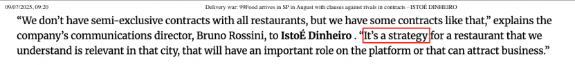 作為2019年成立,最早扎根巴西市場(chǎng)的中國(guó)外賣品牌,99Food曾于2021年遭遇巴西本土外賣巨頭iFood的限制性條款發(fā)難,要求商戶選邊站。