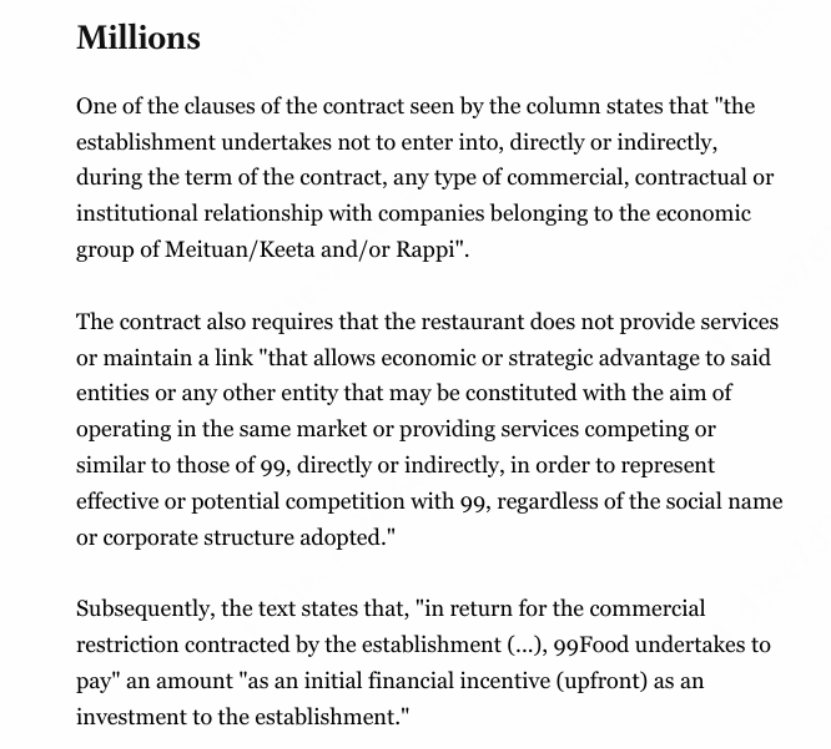 據(jù)媒體報(bào)道,今年6月下旬,巴西當(dāng)?shù)刈悦襟w率先爆出,滴滴的99Food,與當(dāng)?shù)夭糠种B鎖參與商戶取得接觸,提供給單個(gè)商戶提供數(shù)百萬(wàn)元的現(xiàn)金激勵(lì)(預(yù)付款),簽訂針對(duì)美團(tuán)Keeta的限制性合約。部分合約內(nèi)容顯示,禁止商戶與美團(tuán)Keeta合作,但可以繼續(xù)和巴西本國(guó)的iFood外賣平臺(tái)合作。