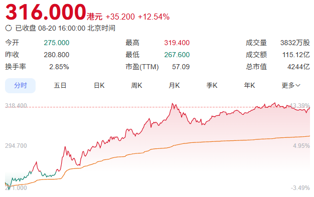 8月20日開盤后,泡泡瑪特股價飛速拉升,總市值首次突破4000億港元大關。