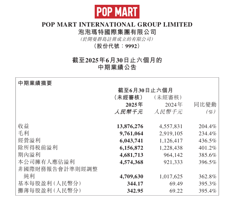 8月19日,泡泡瑪特披露2025年中期業(yè)績。財報顯示,上半年泡泡瑪特營收為138.8億元,同比增長204.4%,經調整凈利潤為47.1億元,同比增長362.8%。上半年公司毛利率為70.3%,同比提升了6.3個百分點,多項數(shù)據(jù)創(chuàng)下歷史新高。
