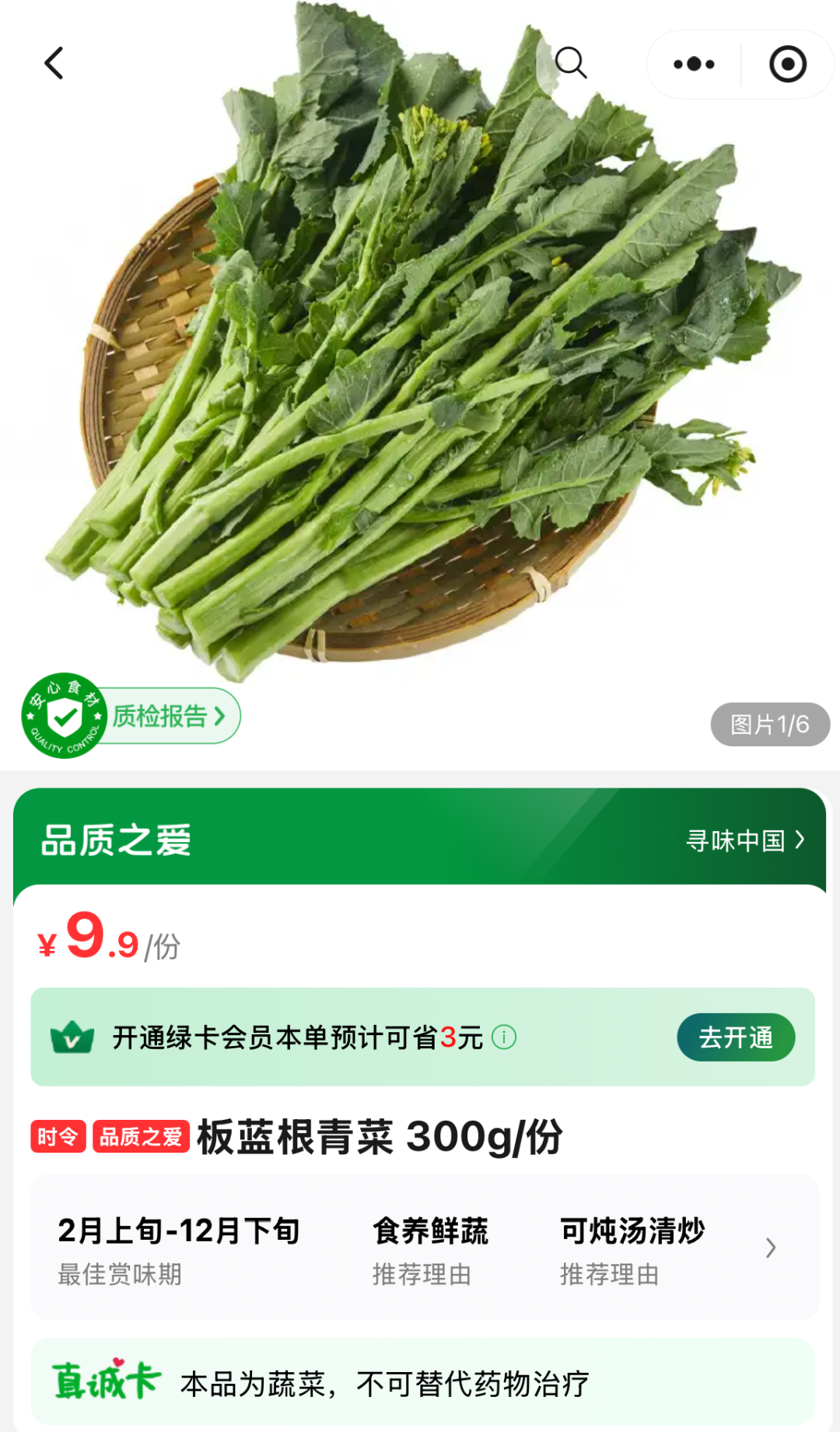 叮咚買菜小程序顯示,300g的板藍(lán)根青菜,售價(jià)達(dá)9.9元,相當(dāng)于1斤要賣近20元。在產(chǎn)品介紹頁(yè)面,叮咚買菜強(qiáng)調(diào)這款產(chǎn)品清甜爽脆不上火,含粗纖維、維生素含量高,適合清炒、白灼、涮火鍋等。