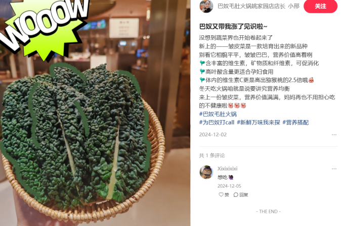 這些火鍋店大多強(qiáng)調(diào)皺葉甘藍(lán)的營(yíng)養(yǎng)價(jià)值。小紅書平臺(tái)上,多位巴奴店長(zhǎng)就曾發(fā)布筆記推介門店的皺皮菜,強(qiáng)調(diào)皺皮菜的健康養(yǎng)生屬性,強(qiáng)化消費(fèi)者的認(rèn)知。