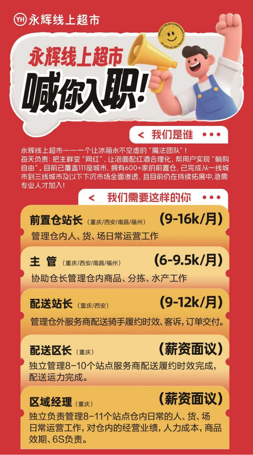 近期“永輝線上超市”公眾號(hào)招聘信息顯示,其目前在重慶、西安、南昌、福州大量招人,可見(jiàn)其模式跑通后,復(fù)制就會(huì)成為水到渠成的事情。