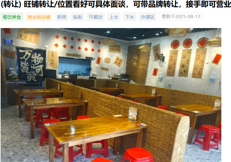 在 58 同城、抖音等平臺上,“生燙牛肉米線店轉(zhuǎn)讓” 的的帖子比比皆是。福州臺江區(qū)一位店主掛出 “接手即可營業(yè)” 的轉(zhuǎn)讓貼,197㎡的沿街旺鋪地處人流密集區(qū),可帶品牌轉(zhuǎn)讓,卻長時間無人問津。